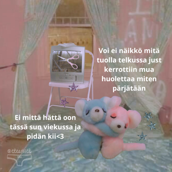Tältä näyttää viiden söpön ja lempeän meemitilin pehmeiden aivosolujen yhteentörmäys. Instagramissa toimivat meemitilit @eteerisetpikkarit, @kiukkupusseaysiideri, @rumpurulla, @saastorakkaus ja @vitamiinitytot ilmaisevat itseään usein pastellivärein, pörröisin eläimin ja sadunomaisella kuvastolla.