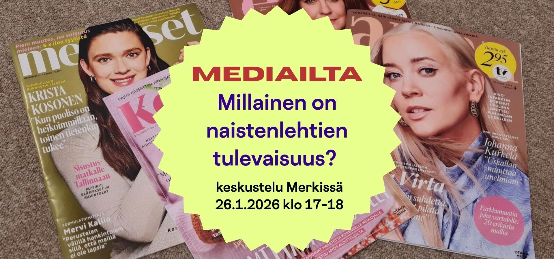 Tule Median museo Merkkiin (Ludviginkatu 2-4, Helsinki) maanantaina 26.1. klo 17-18 keskustelemaan aikakausmedian tulevaisuudesta!