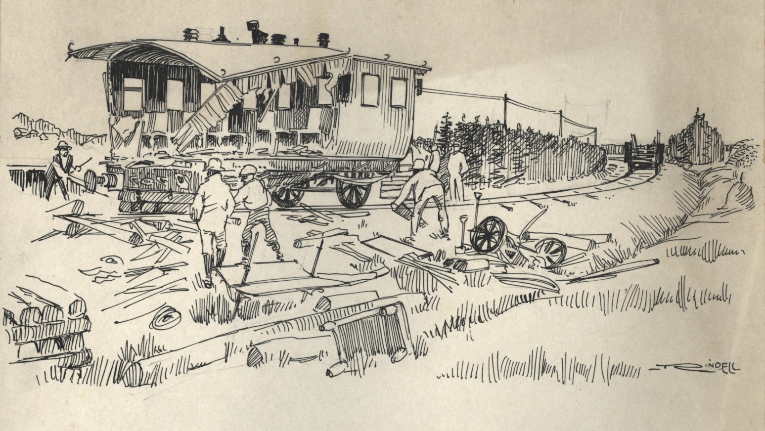 Onnettomuus Porvoon rautatiellä, Rafael Rindellin uutispiirros 21.9.1918. Kuva: Merkin arkisto.